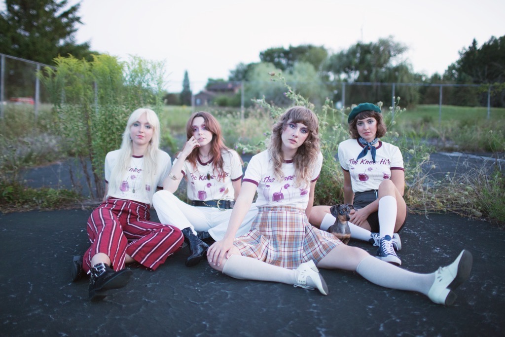 Only formed recently towards the very end of last year, rubber soul-suited and go-go booted power-pop outfit The Knee Hi’s offer us well needed, wholesome respite of musical simplicity and visual experimental romanticism. The dreamy Chicago-based four-piece have released just one single, ‘Darlin, Darlin’, a track with dark lyrical undertones married with a warmly lit characteristic doo-wop rhythm. Headed by Devyn Crimson (Sable-Starr/Pamela Des Barres reincarnated) on bass with fellow members Alice Strider on lead guitar, Chris Goeken on drums and Ash Goeken on rhythm guitar. Combining post-war 50s doo-wop with 60s power pop, the shimmering four-piece keep in line with a solid retro aesthetic – this quickly garnering a worldwide vintage ‘nostalgerati’ online following dedicated to support these fresh-faced flower children. In a time where the commercial market is still so saturated with male artists and bands, these four women are taking the online 60s and 70s retromania scene by storm, we love to see it.
