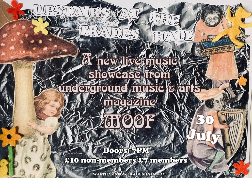 MOOF will be starting up a brand new bimonthly live music showcase at the brilliant Walthamstow Trades Hall. The Trades Hall is a real institution and community hub which has been going for 100 years, so we’re very happy to be putting on our new music night here. The upstairs room is also somewhat of a time capsule from the 70s (lots of brown leather, and the pints are still on 70s prices too!)
